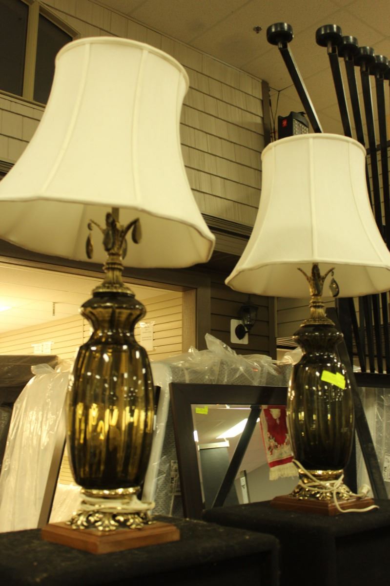 PAIR OF VINTAGE METAL & GLASS LAMPS WITH WOOD BASE