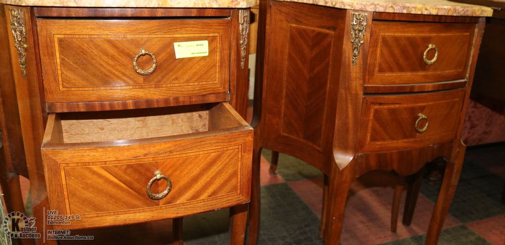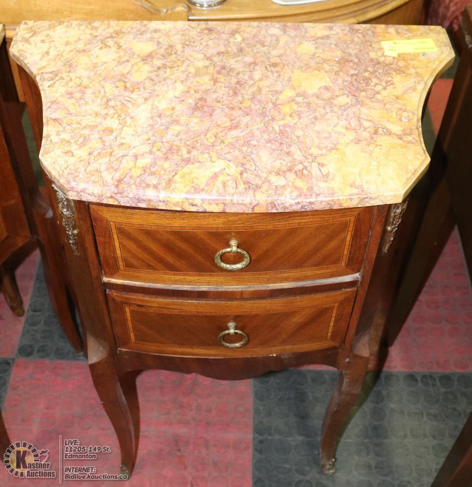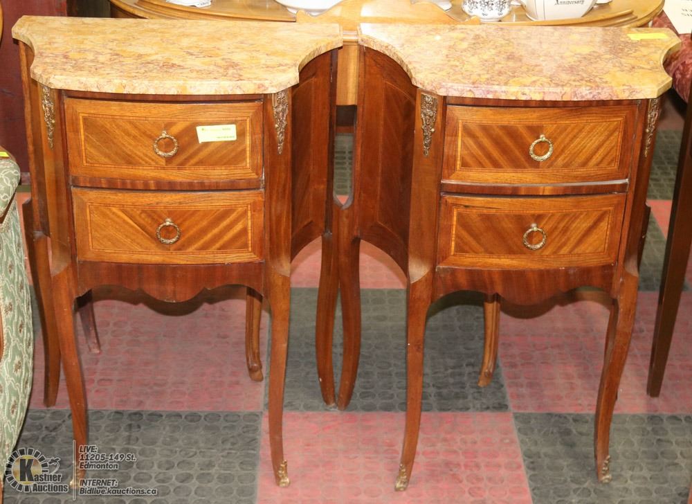 PAIR OF VINTAGE WOOD INLAY MARBLE TOP END TABLES