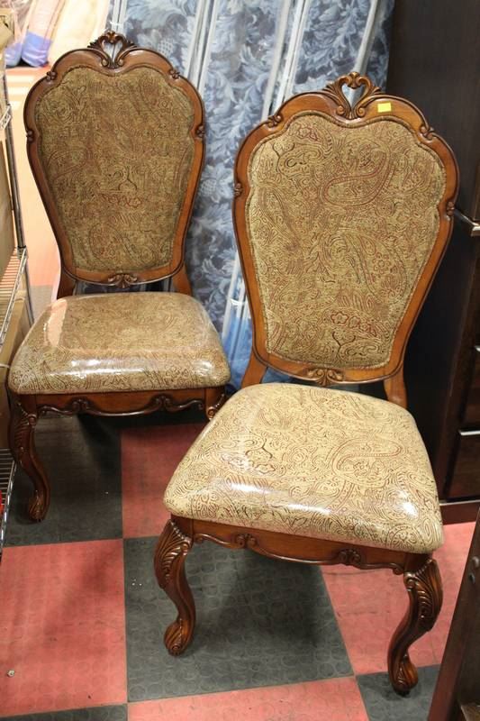 PAIR OF WOOD AND FABRIC CARVED STYLE SIDECHIARS