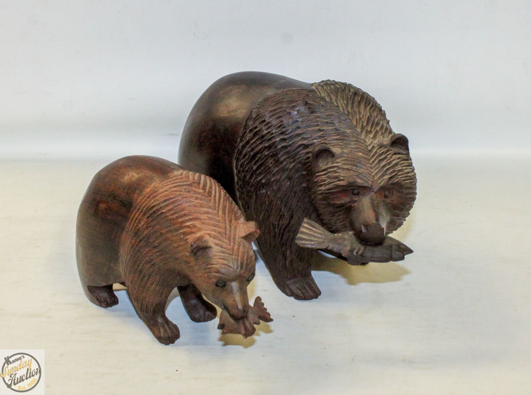 PAIR OF WOOD CARVED BEAR W/ FISH SCULPTURES