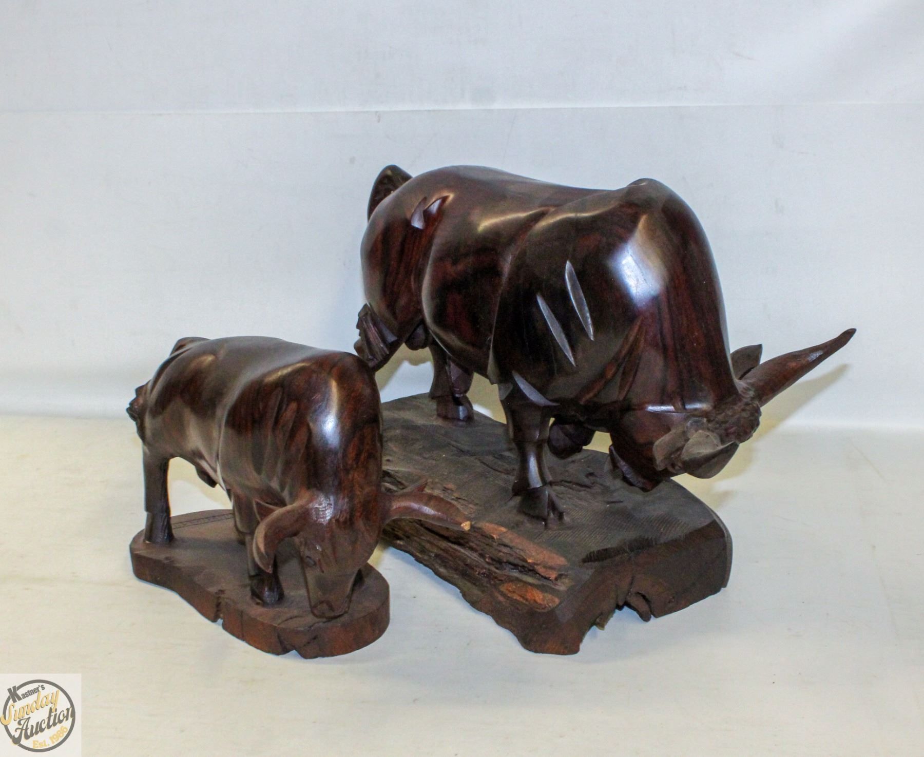 PAIR OF WOOD CARVED BUFFALO FIGURES - DARK FINISH