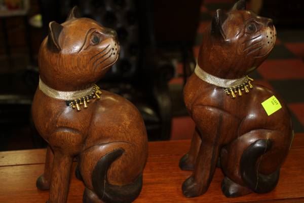 PAIR OF WOOD CARVED CAT ORNAMENTS