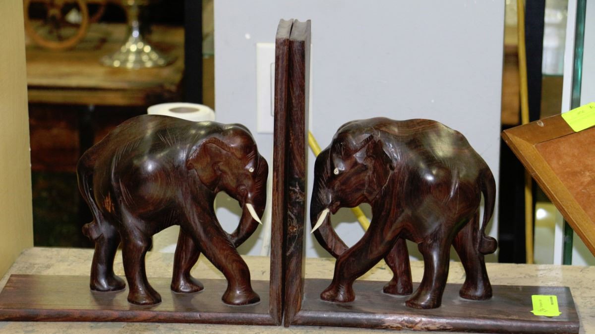 PAIR OF WOOD CARVED ELEPHANT BOOK ENDS