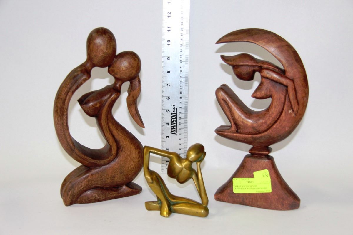 PAIR OF WOOD CARVED ORNAMENTS WITH BRASS FIGURE