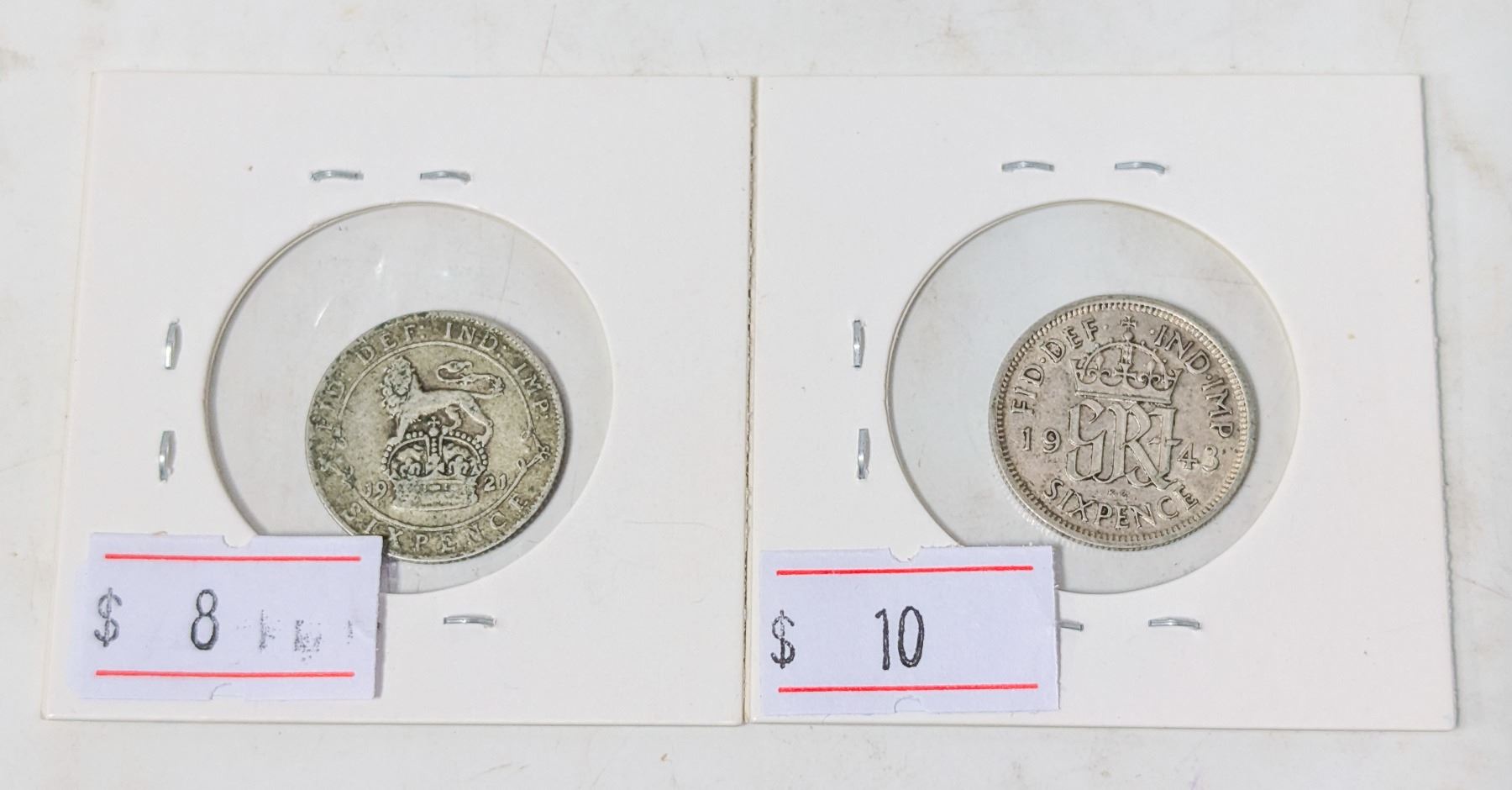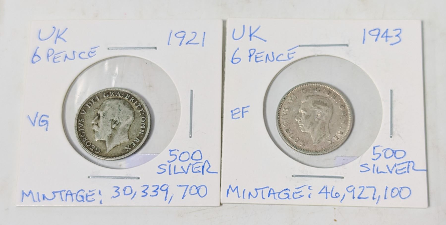 PAIR UK 6 PENCE SILVER COINS 1921/1943