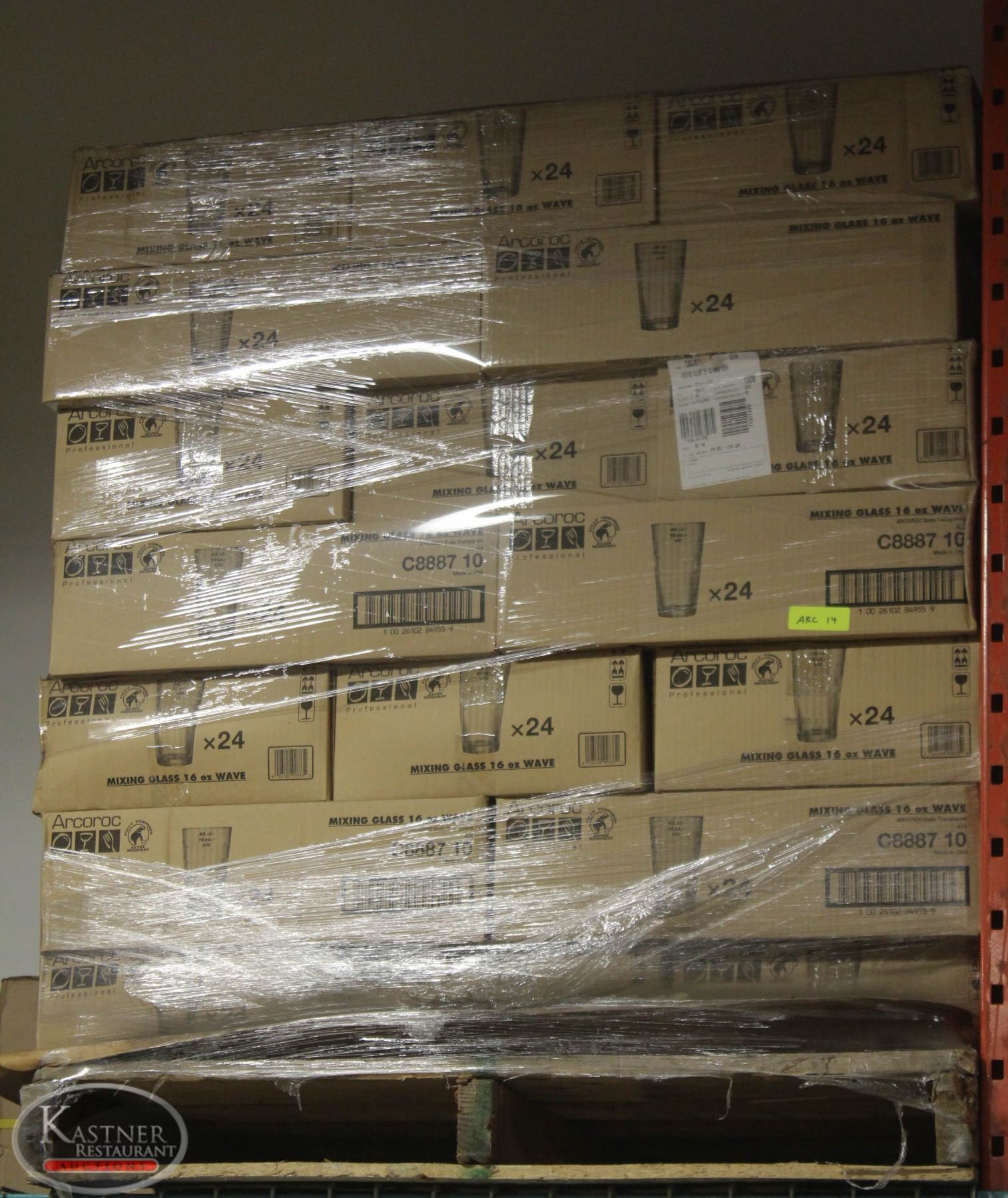 42 CASES TOTAL. - ARC 14 - NEW, 42 CASES OF 24 ARCOROC CARDINAL C8887 COOLER/MIXING GLASSES, 16 0Z. FULLY TEMPERED. 1008 GLASSES TOTAL. *PALLET MAY INCLUDE SOME BROKEN GLASSES
