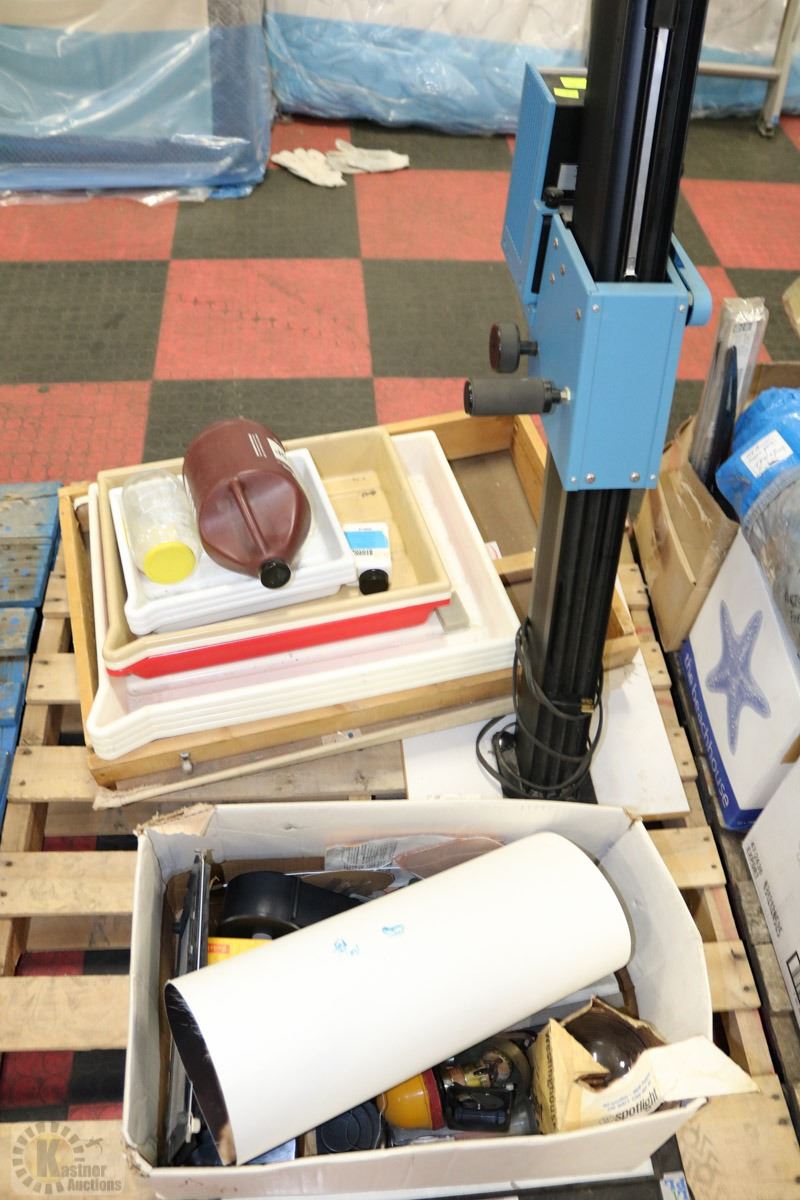 PHOTOS. HAS BOX OF BULBS AND KODAK LAMP KIT AND SOLUTIONS, SOLUTION TRAYS, PHOTO PAPER CUTTING TABLE, AND BESELER MODEL 67C PHOTO ENLAERGER AND BASE
