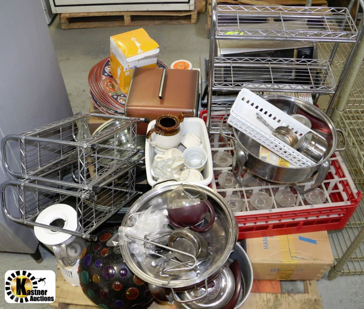 3 RACKS,TOASTER OVEN,POTS, PANS,PLATES ,CUPS AND MORE