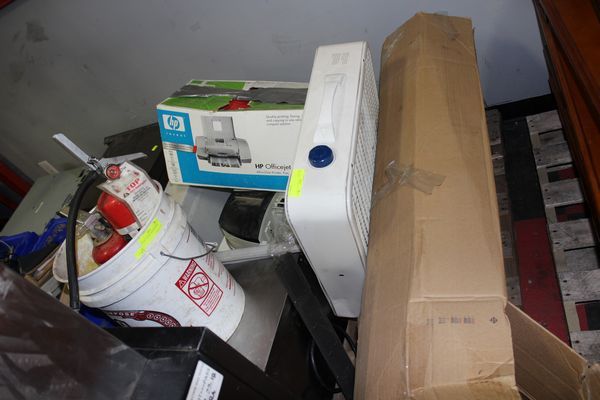 PALLET W BOX FAN/FIRE EXTINGUISHERS/PRINTERS ETC