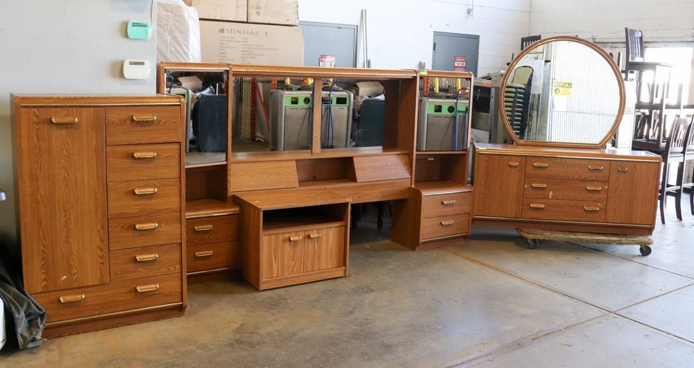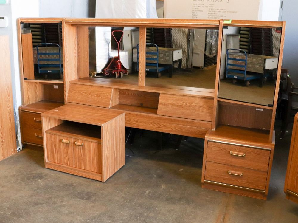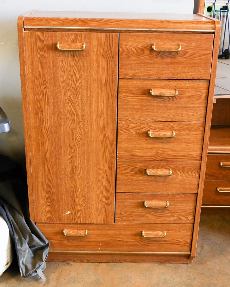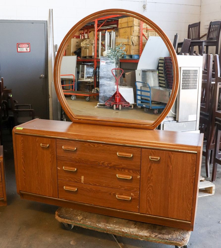 HUTCH & MIRROR W/ LIGHTING, DRESSER, END TABLE W/CUPBOARDS(AND CASTORS). GLASS DOORS W/ HUTCH CABINET LIGHTING. 109-1/2" X 17" X 62" UPRIGHT DRESSER: 36" X 17" X 54-1/2"DRESSER WITH MIRROR: 66" X 17" X 29" (42" W/ MIRROR) SHELF STORAGE. GENERAL. HOME.