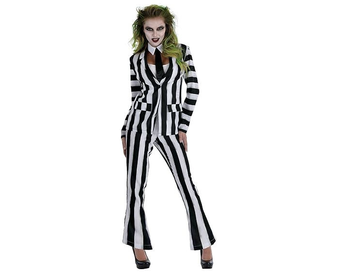 PARTY CITY BEETLEJUICE COSTUME FOR WOMEN - COSTUME INCLUDES JACKET, SLEEVES, SUSPENDERS, PANTS, & COLLAR WITH ATTACHED TIE - COSTUMES FOR HALLOWEEN, BIRTHDAY PARTIES, & THEMED EVENTS MULTI