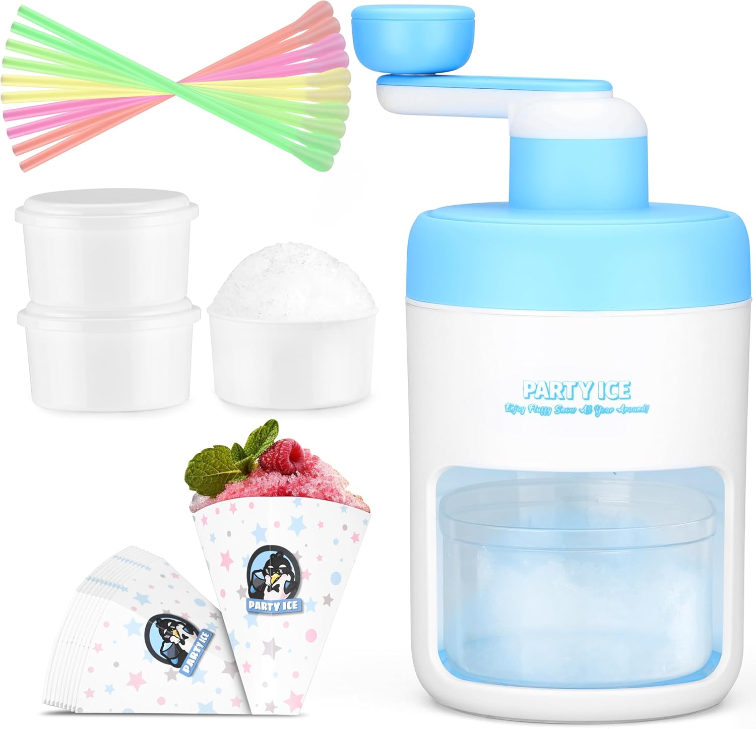 PARTY ICE MANUAL SHAVED ICE MAKER MACHINE, ICE SHAVER MACHINE, SNOW CONE MAKER MACHINE, 10 CUPS 10 SPOON STRAWS & RECIPES INCLUDED (BLUE), PI-MIS01B