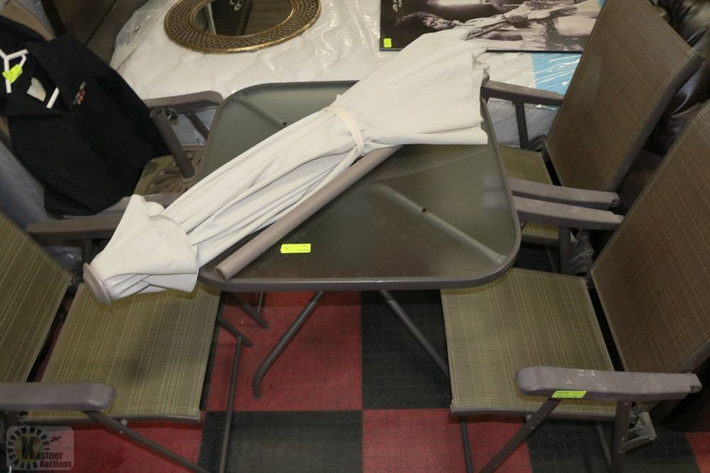 PATIO TABLE WITH 4 FOLDING CHAIRS AND UMBRELLA