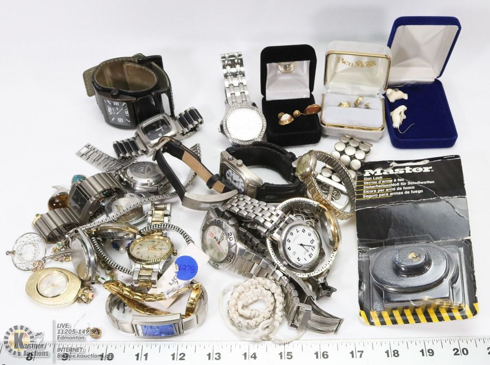 PAWNSHOP BOX OF WATCHES , GUNLOCK AND MORE ....