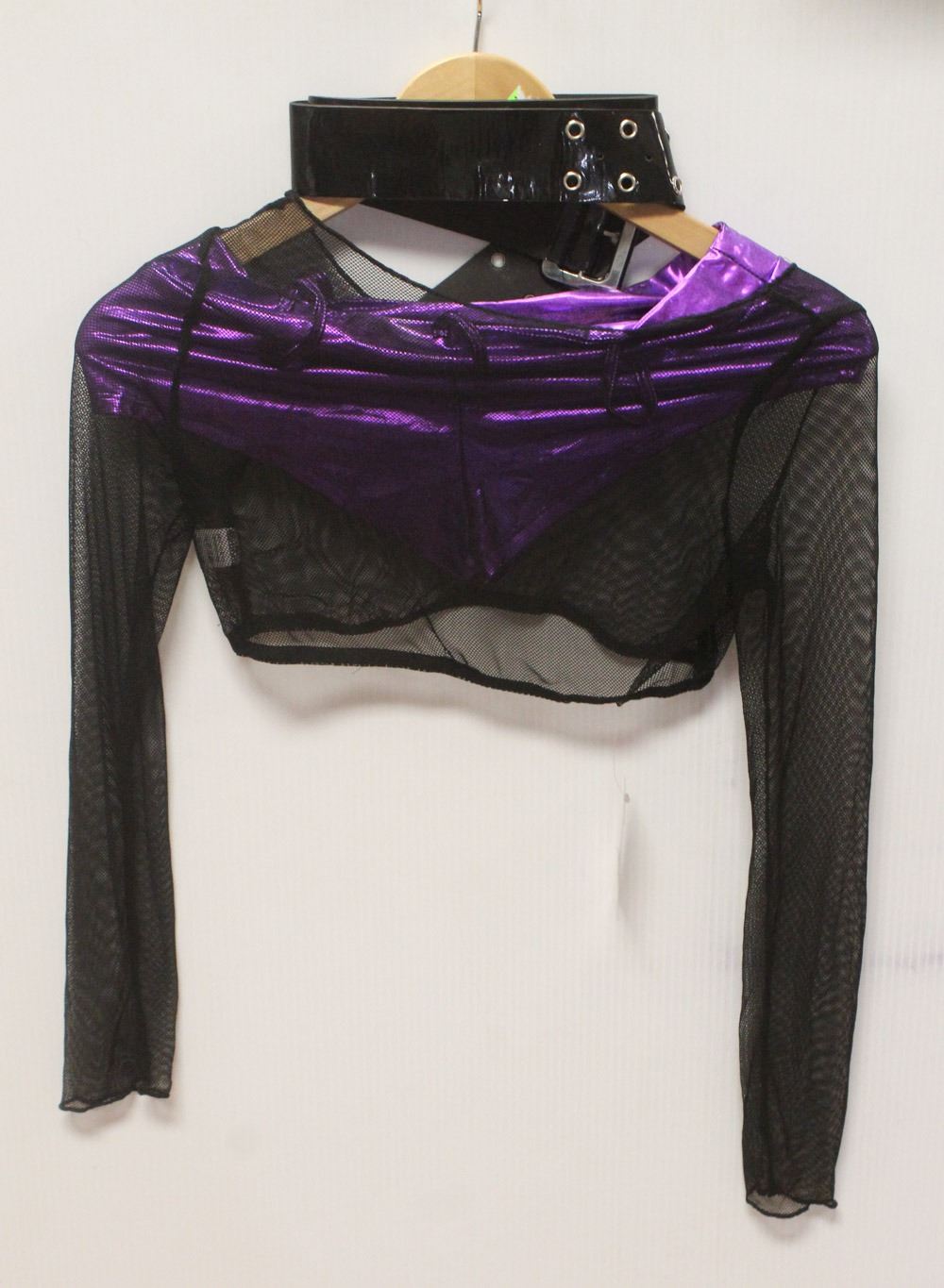 W/ METALLIC PURPLE BOOTY SHORTS & BELT. SIZE 6