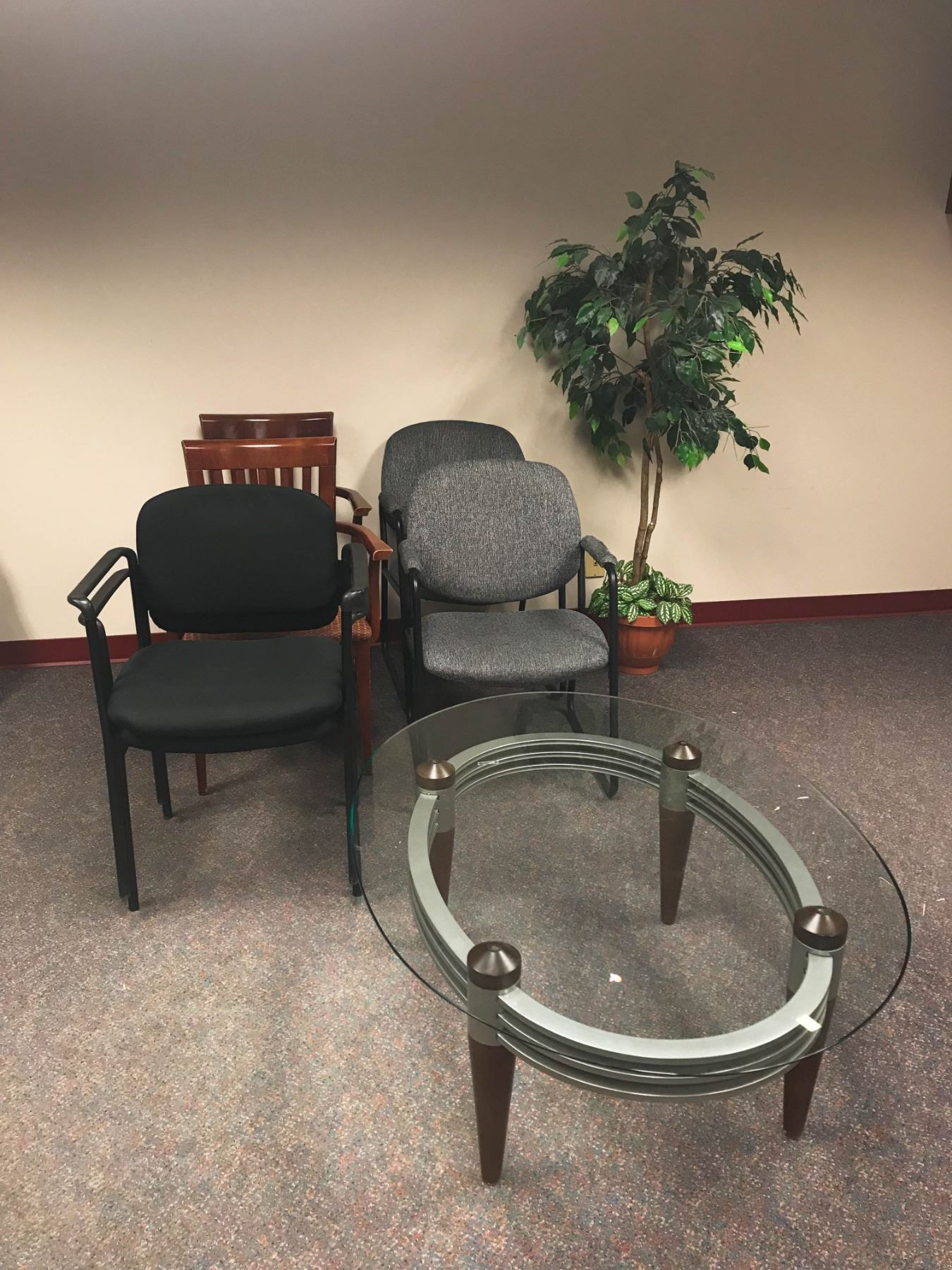RACETRACK & CASINO BETWEEN 10:00AM TO 4:00PM LOT OF 6 ASSORTED CHAIRS, GLASS COFFEE TABLE & ARTIFICAL PLANT