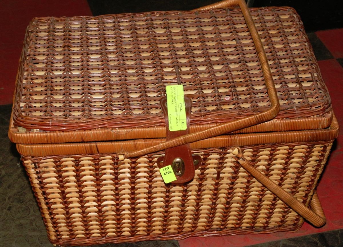 PICNIC BASKET WITH 4 PLATES, 4 CUPS, 4 FORKS,