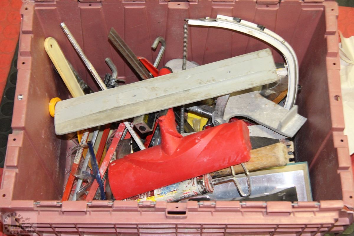 PINK BIN FULL OF DRYWALL & PAINT TOOLS