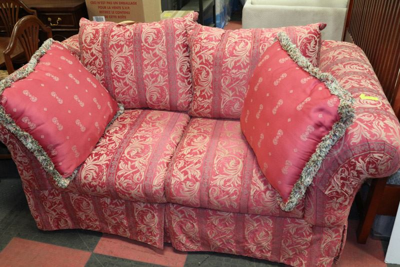 PINK FABRIC PLUSH LOVESEAT W/ CUSHIONS