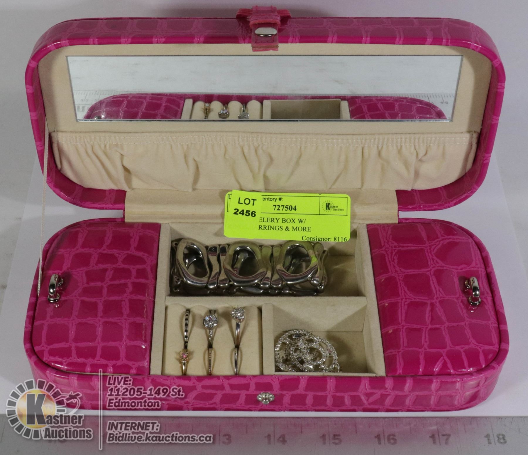 PINK JEWELERY BOX W/ RINGS,EARRINGS & MORE