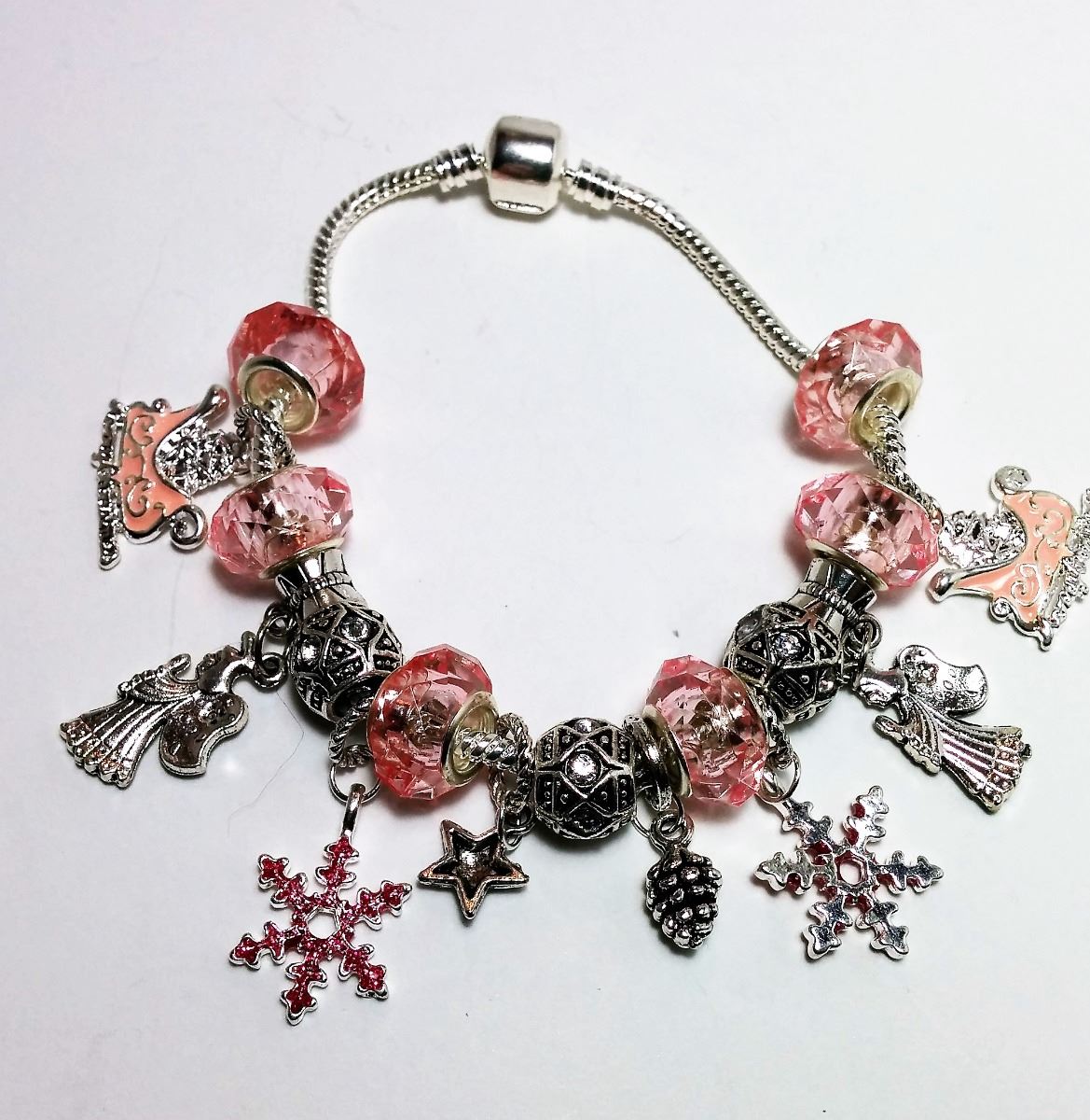PINK CRYSTAL & TIBETAN SILVER BEADS WITH CLEAR CRYSTALS, PINK CRYSTAL SNOWFLAKE CHARMS, PINK SANTA SLEIGH CHARMS , TIBETAN SILVER ANGEL CHARMS AND A STAR & A PINECONE CHARM