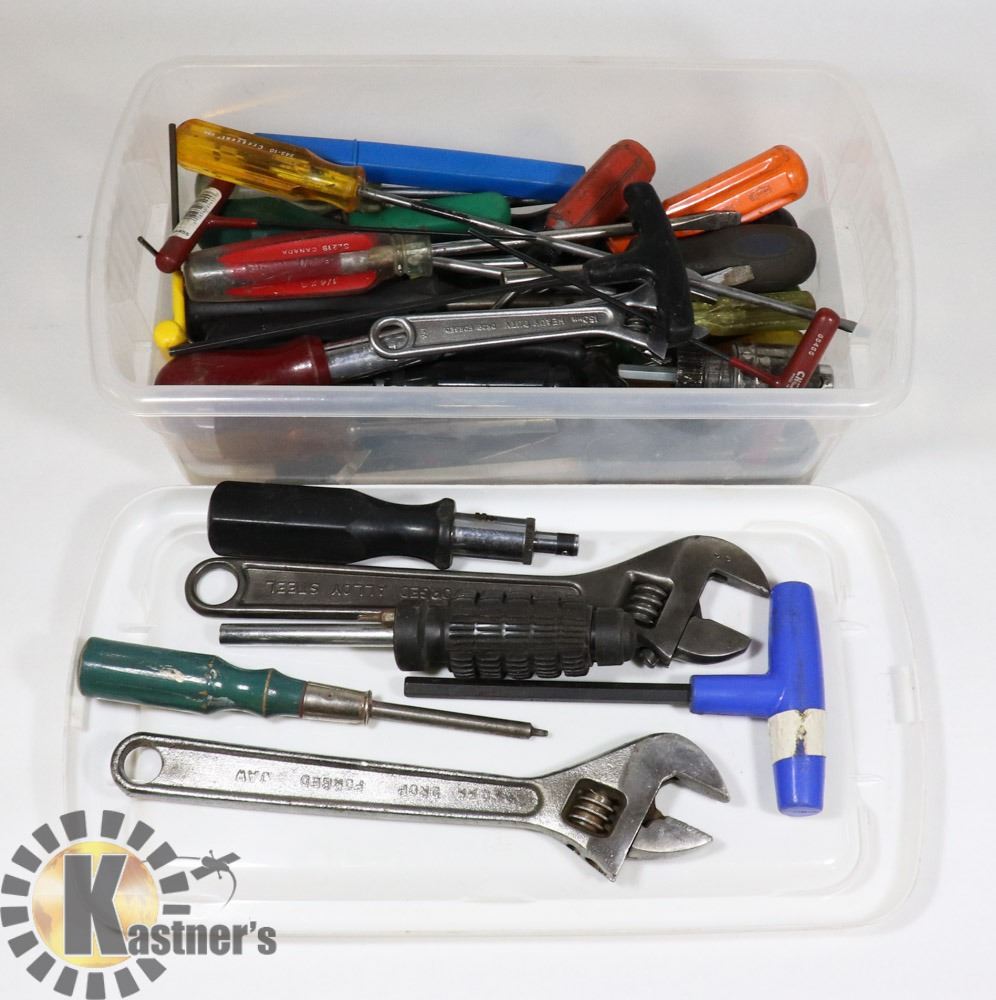 PLASTIC CONTAINER OF ASSORTED TOOLS.