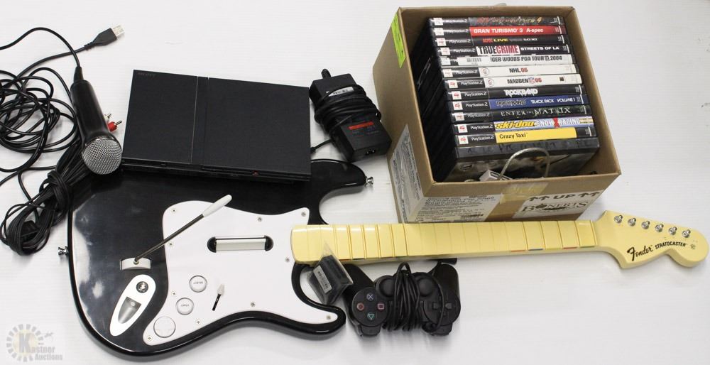 13 GAMES INCLUDING GRAN TURISMO 3 A-SPEC AND CRAZY TAXI, ROCK BAND MIKE + GUITAR, 128MB CARD, AND 8MB CARD.
