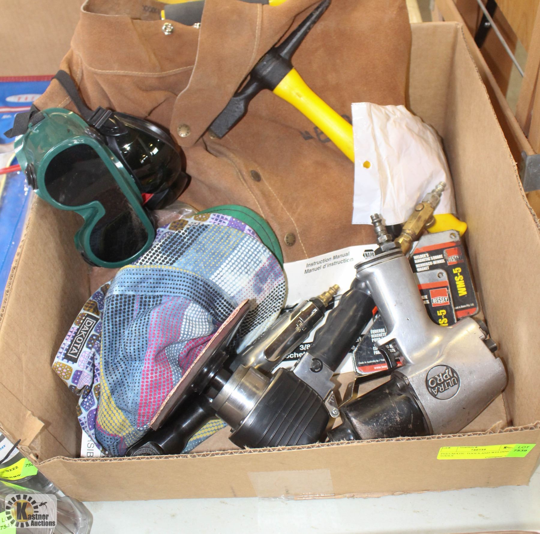 POWER FIST SANDER, 1/2 ULTRAPRO IMPACT, 3/8 ULTRAPRO RATCHET. 4 NEW WELDING CAPS, TWO CUTTING GOGGLES, 2 MAGNETIC SQUARES, LEATHER 4X-LARGE WELDING JACKET