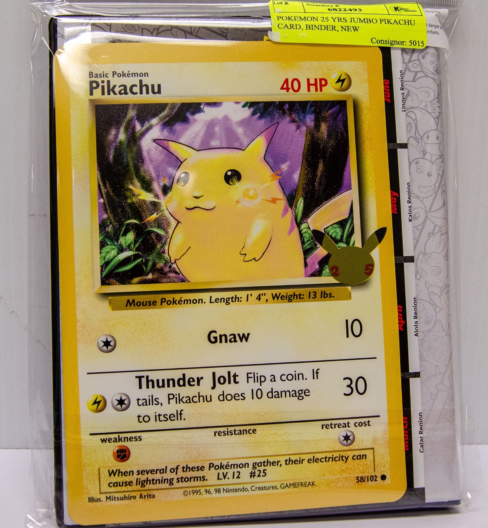 POKEMON 25 YRS JUMBO PIKACHU CARD, BINDER, NEW