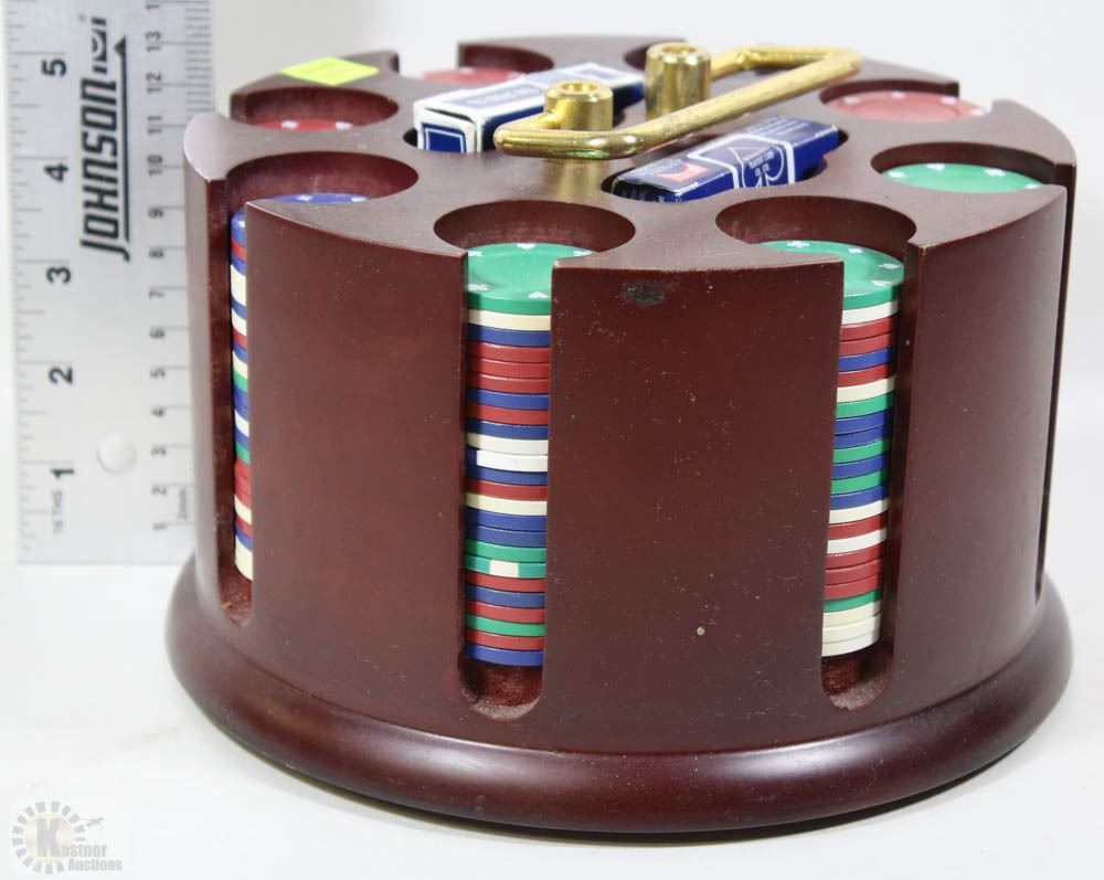 POKER SET IN WOOD CHERRY CASE THAT SWIVELS