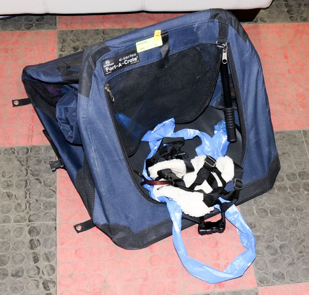 PORTABLE DOG KENNEL WITH HARNESS AND 2 LEASHES.