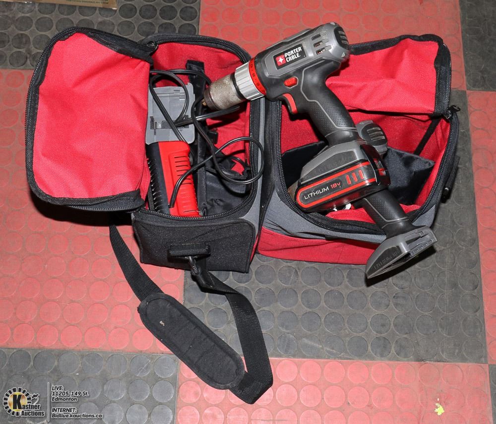 CHARGER, 2 BATTERIES, & PORTER CABLE SOFT CASES. BATTERIES ARE PRETTY WEAK. TOOLS
