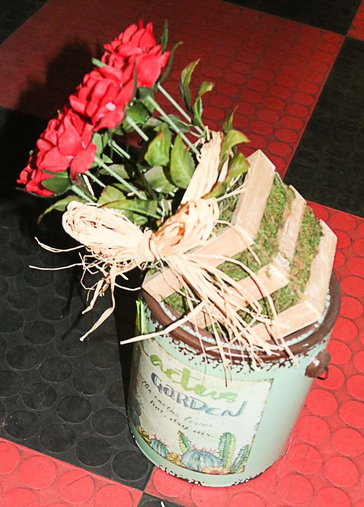 POTTERY CACTUS GARDEN PAINT POT & RED ROSES