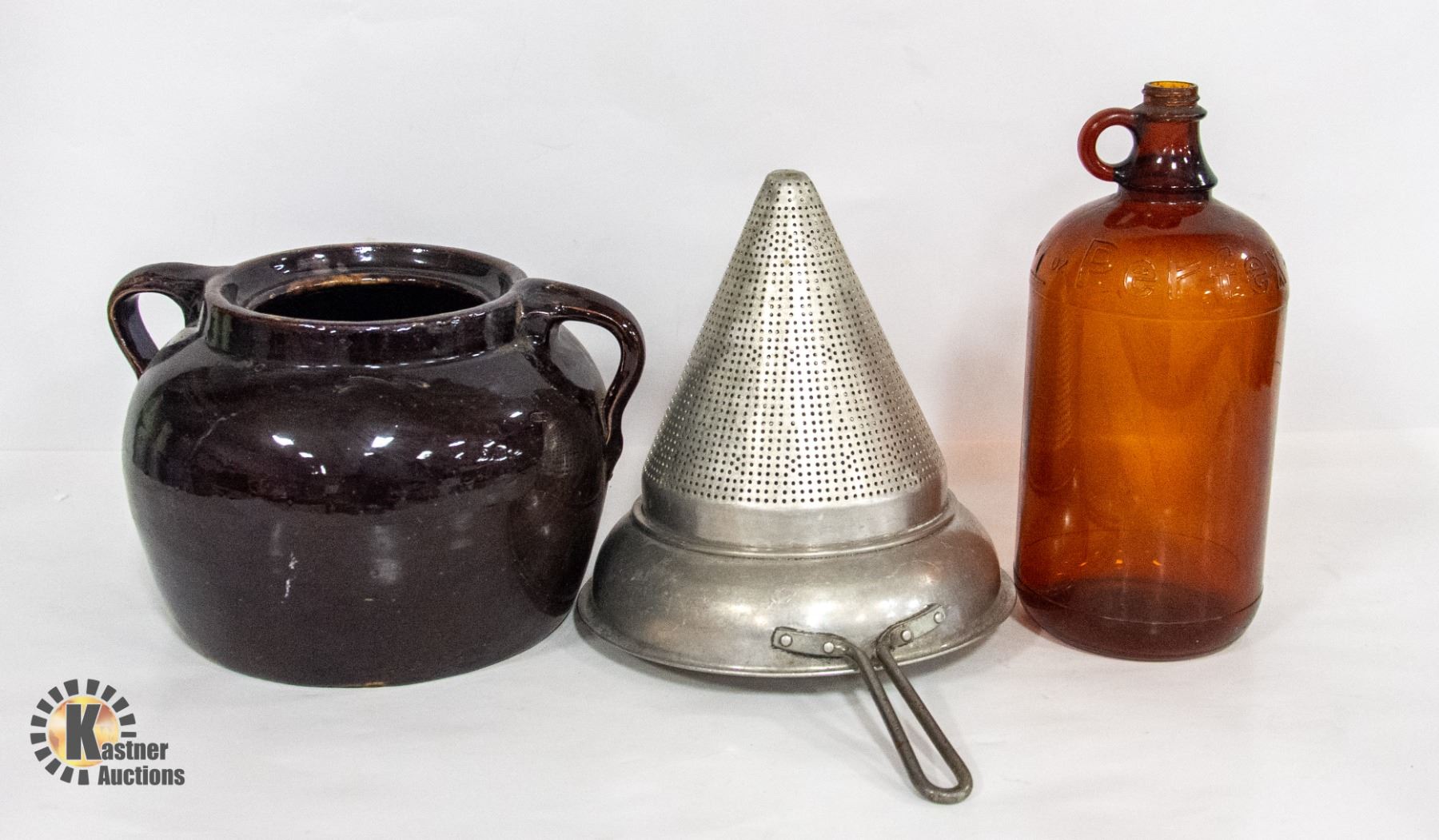 PREFAX BROWN BOTTLE/VINTAGE STRAINER + POT