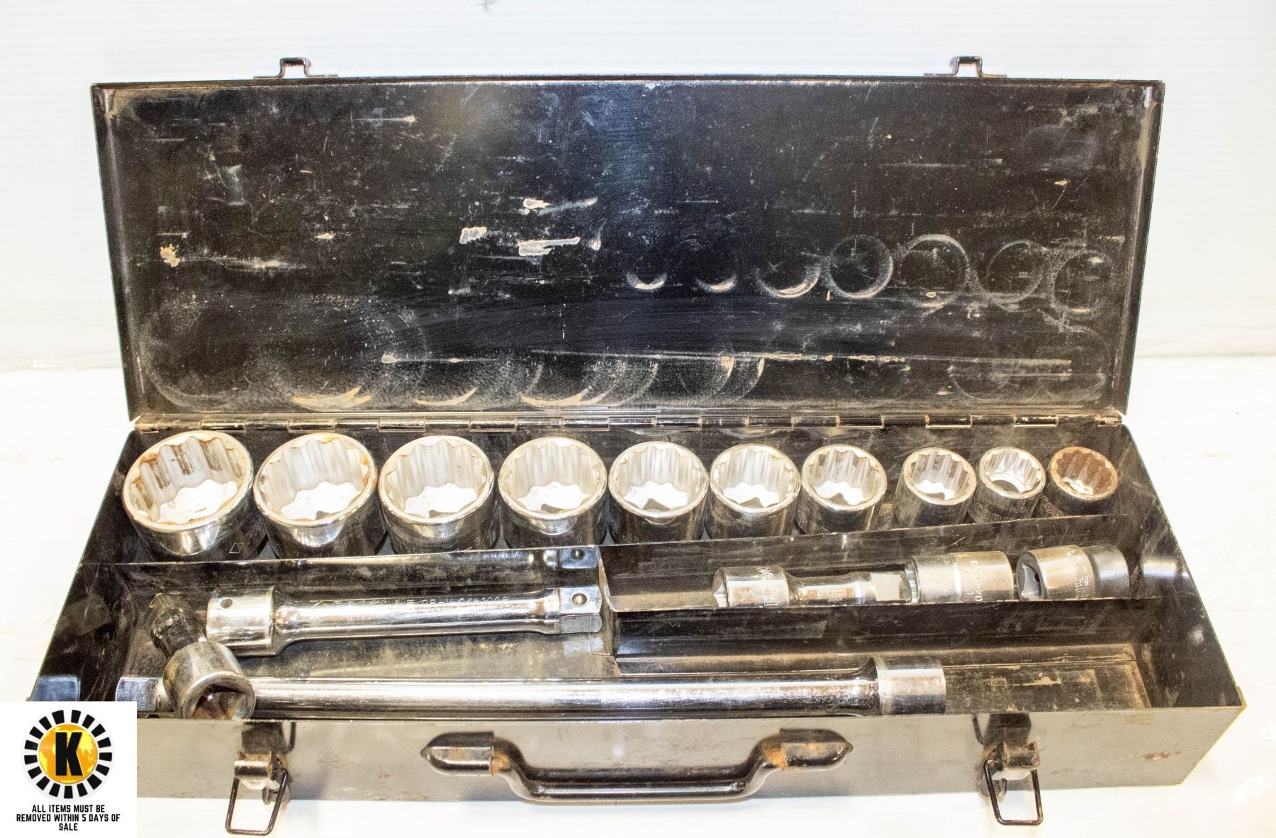 WITH 4 EXTENSIONS - LARGE SOCKETS FROM 2"- 7/8", 16-PIECES IN BLACK STEEL ORGANIZER CASE - DUAL LATCH & LOCKABLE (NEW MSRP - $1,247 CDN. AT CANADA SUPPLY) **ALL ITEMS MUST BE REMOVED BY 5PM SATURDAY, NOVEMBER 4TH 2023. ALL REMAINING ITEMS WILL BE SUBJECT TO A $6.00 PER DAY STORAGE CHARGE. ANY ITEMS REMAINING AFTER MONDAY, NOVEMBER 18TH, 2023 WILL BE CONSIDERED FORFEITED. NO REFUNDS WILL BE ISSUED FOR FORFEITED ITEMS. TO SCHEDULE A PICK UP APPOINTMENT CLICK HERE