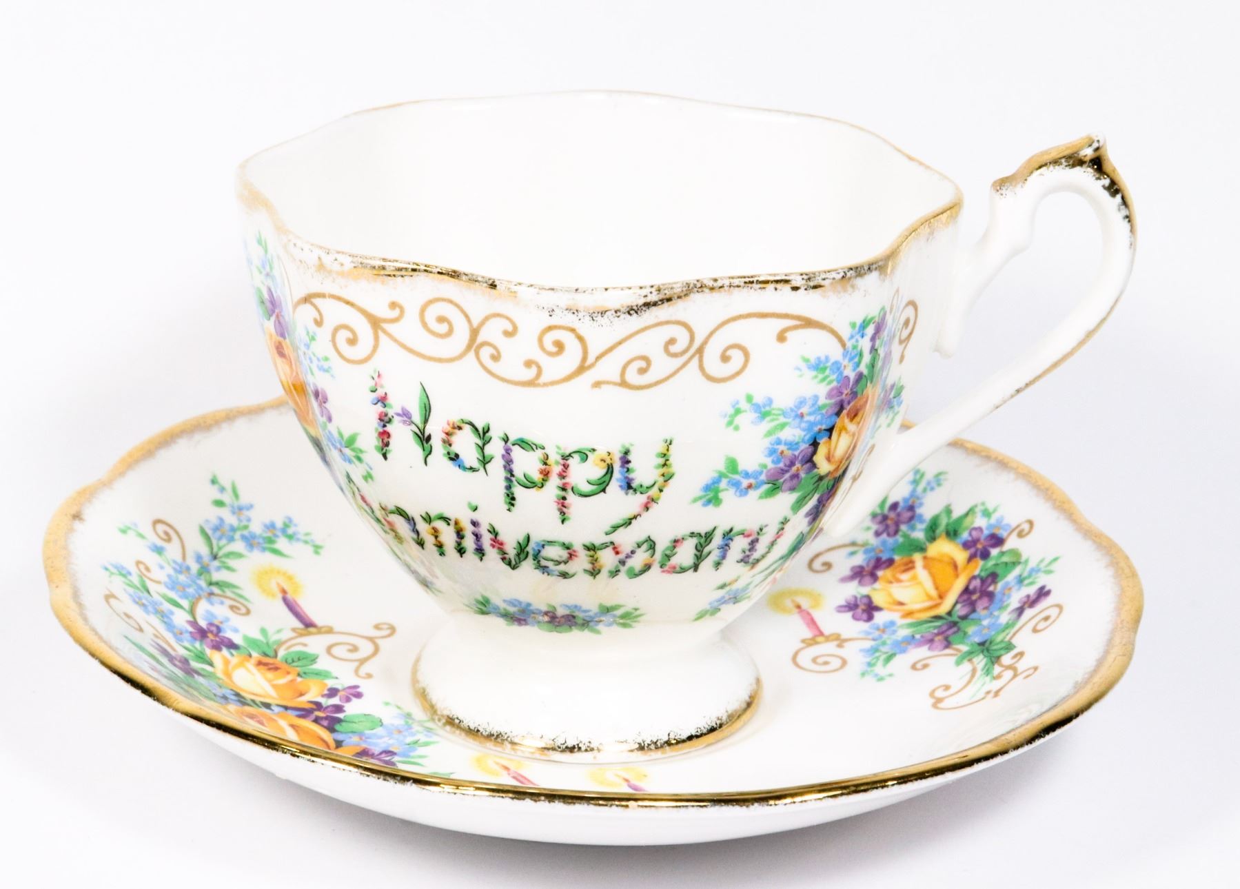 QUEEN ANNE "HAPPY ANNIVERSARY" TEACUP AND SAUCER