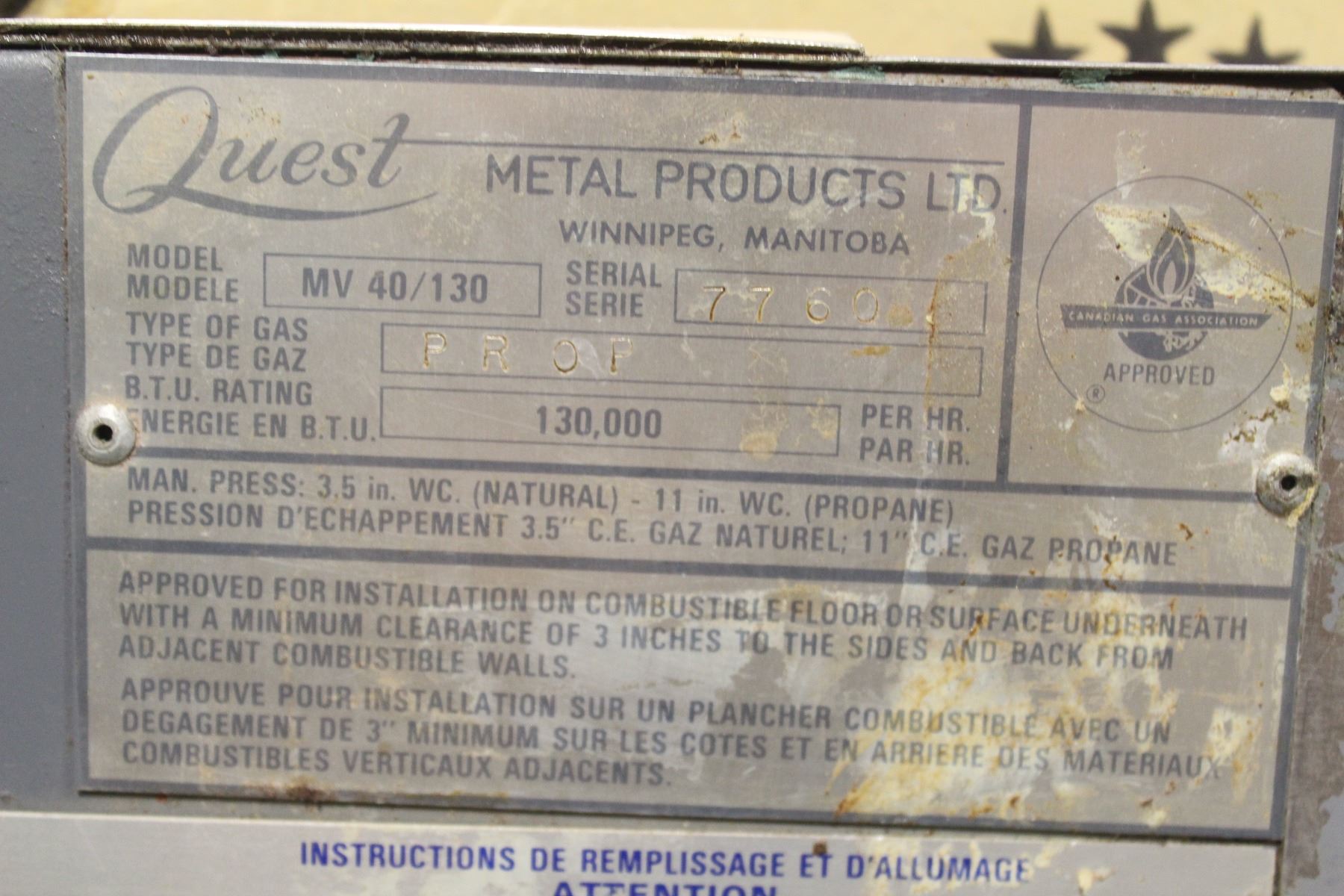 130,000 BTU'S/HR, FACTORY SET FOR PROPANE GAS