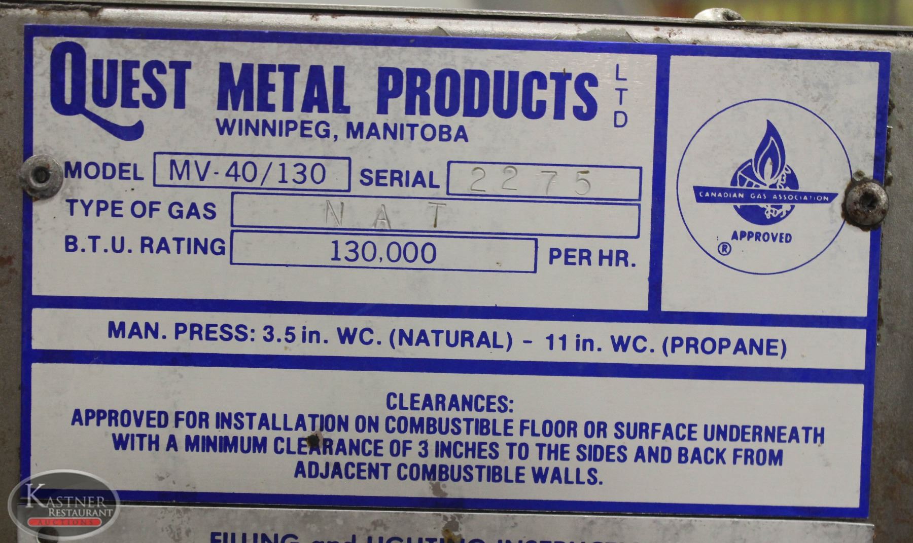 *NO BASKETS, M#: MV- 40/130, 130KBTU'S/HR NATURAL GAS.