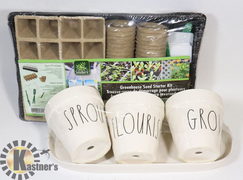 SIGNED SPROUTS,FLOURISH AND GROW ÿON A WHITE PORCELAIN TRAY ALONG WITH GREENHOUSE SEED STARTER KIT NEW IN BOXÿ
