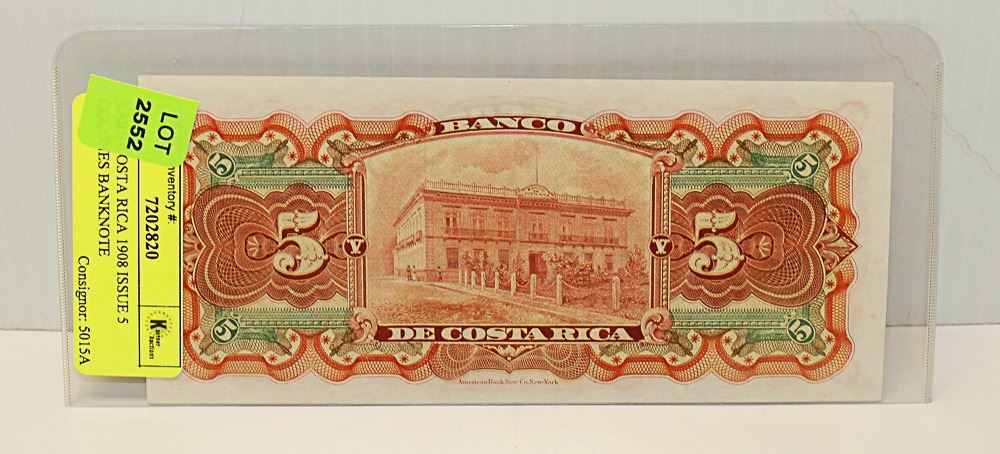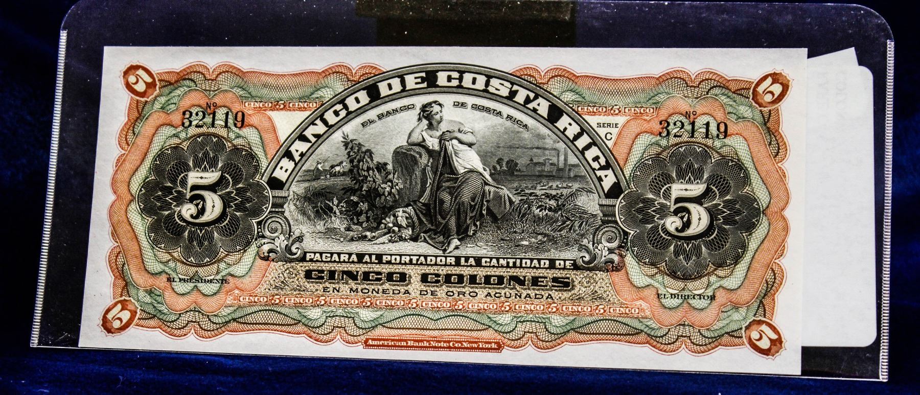 RARE COSTA RICA 1908 ISSUE 5 COLONES BANKNOTE