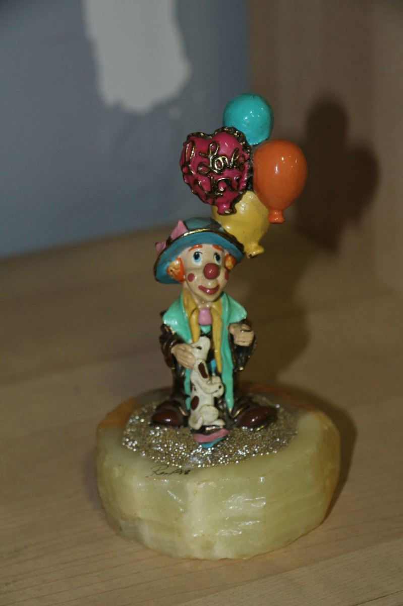 ENAMELLED METAL ON ONYX BASE - CLOWN W/ DOG & BALLOONS FIGURINE, #3985 OF 8500 & SIGNED