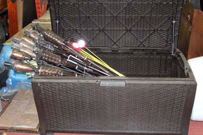 RATTAN STYLE PATIO STORAGE BOX W TIKI TORCHES