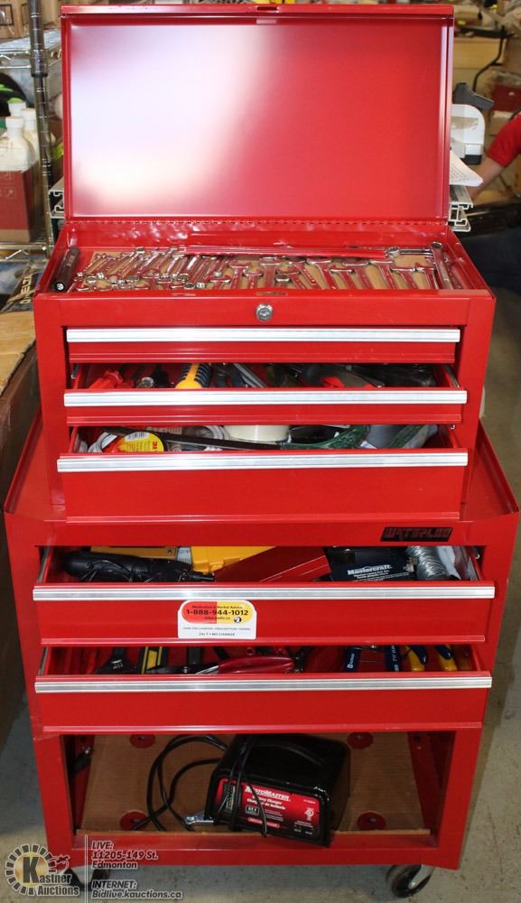 TOOLBOX (W/KEYS)AND BOTTOM STORAGE & FULL OF TOOLS -WRENCH SET, STAPLER, CAR BATTERY CHARGER, ETC. KEYS ON TAG #95