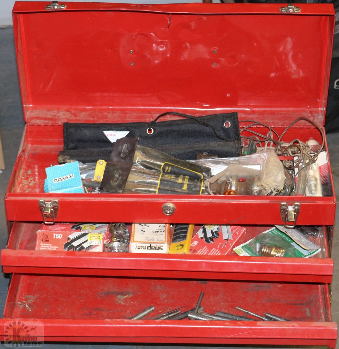 RED TOOL BOX FULL OF TOOLS 3 DRAWER AND LID