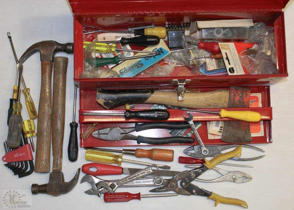 RED TOOL BOX WITH HATCHET, HANDTOOLS AND MORE