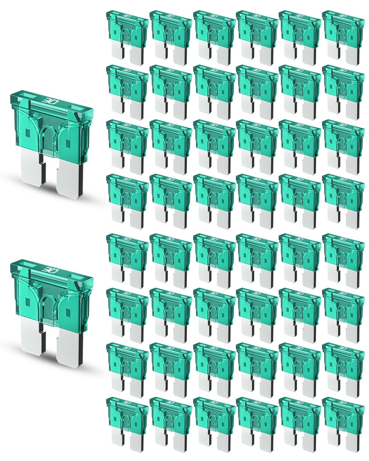 RISEUVO 50PCS 30A STANDARD CAR FUSES - 30 AMP AUTOMOTIVE FUSES(ATO/APR/ATS), 32V (12/24V) BLADE FUSE FOR RV/TRUCK/SUV