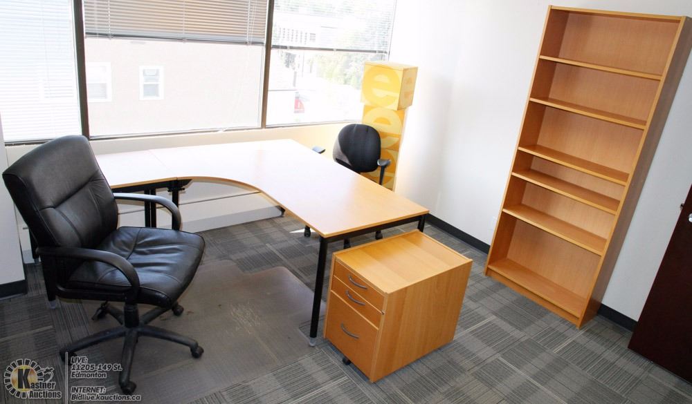 CHAIR, WAITING CHAIR, CARPET PROTECTOR AND 4 LETTER 'e' DISPLAY BOXES. DESK LEFT RETURN 28"H X 63"W X 31"D. BOOKCASE 79"H X 31.5"W X 11"D. DISPLAY BOXES 14" X 14" X 14".