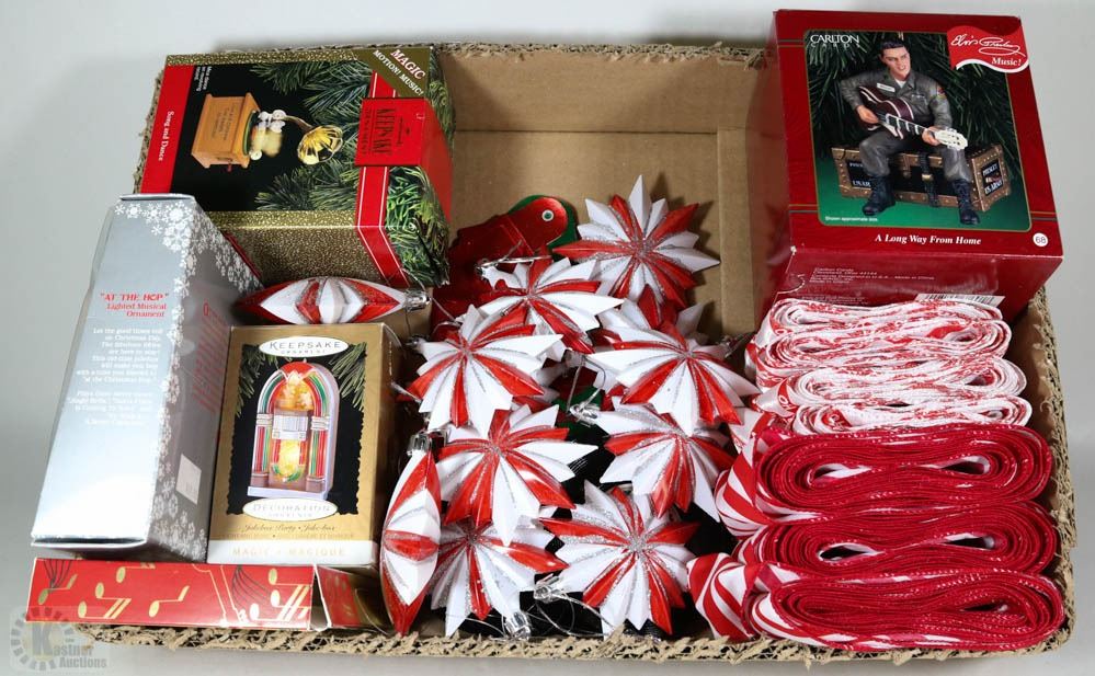 ROCK & ROLL ORNAMENTS, RED & WHITE RIBBON & ORNAMENTS.