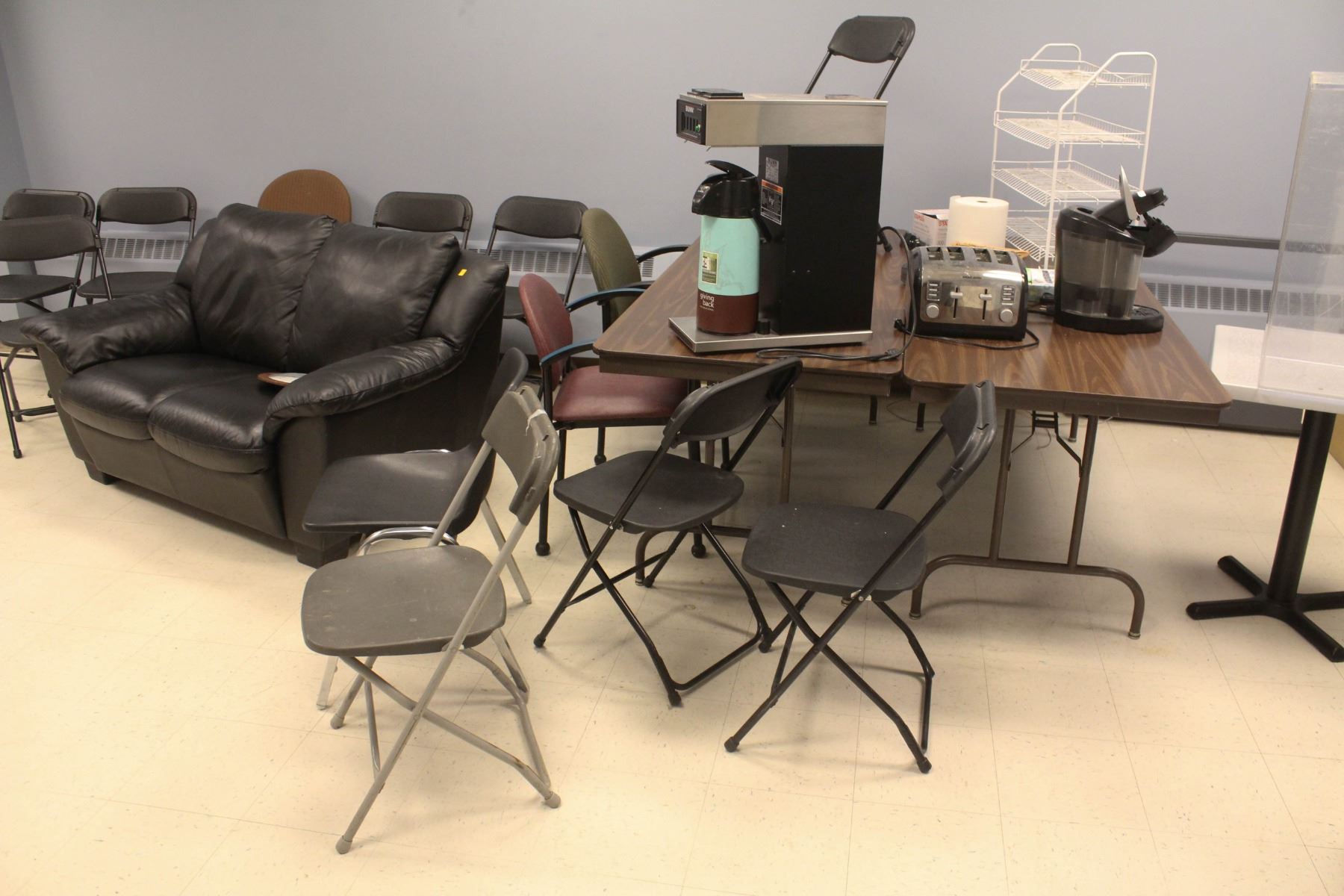 FOLDING CHAIRS, TABLES, BLACK LEATHER LOVESEAT & MORE, NOT INCLUDING WHAT'S IN THE CLOSED DOOR @ FLOOR 1