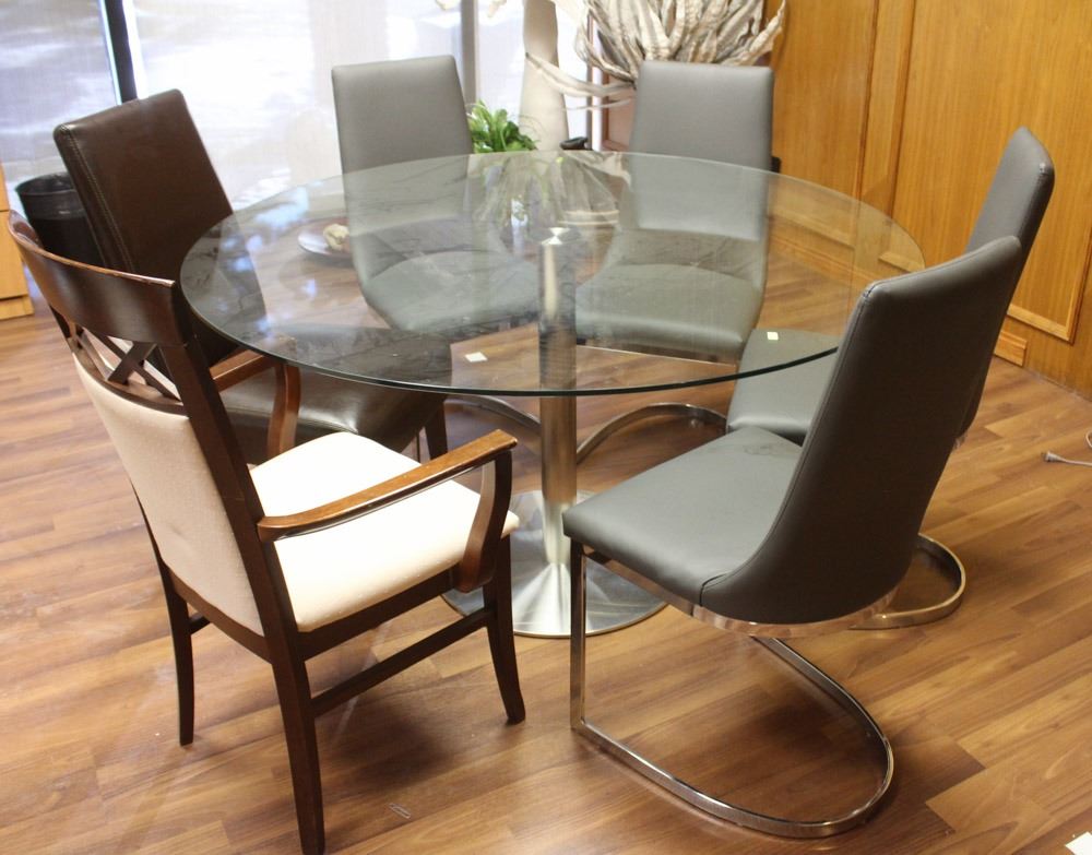ROUND 55" GLASS TOP TABLE WITH 5 ASSORTED CHAIRS